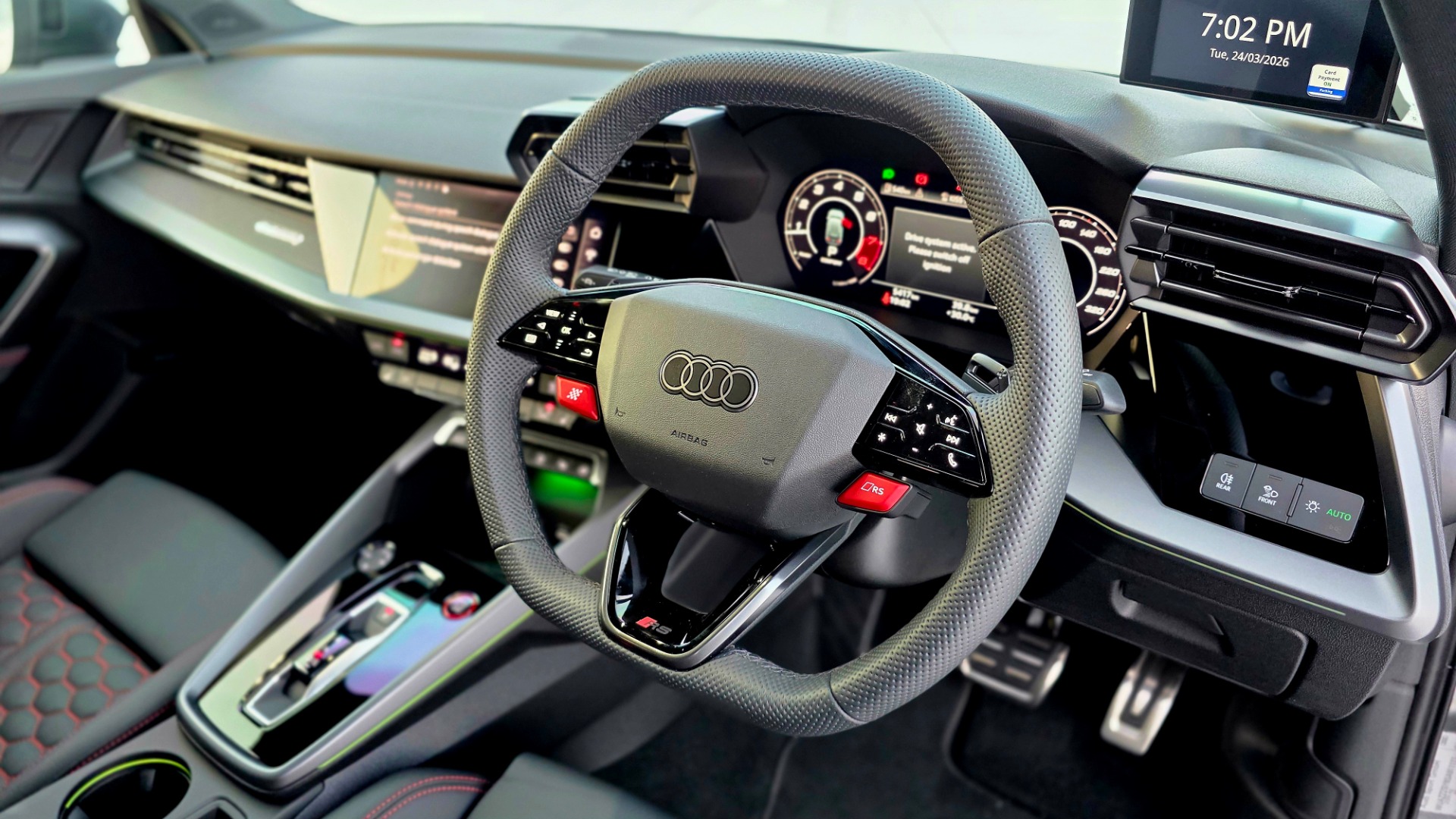 The steering wheel is unmistakably RS—flat-top and flat-bottom, designed to feel purposeful and race-inspired in your hands. Front and centre are the signature red buttons, giving you instant access to RS Individual and RS Performance modes, transforming the car's character at a press. A dedicated checkered flag button adds to the theatre, putting performance settings right at your fingertips and reinforcing the RS3's driver-first, track-ready attitude.