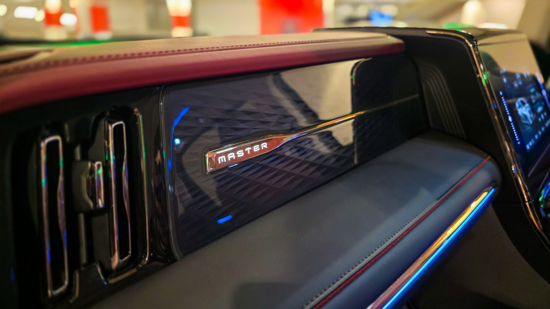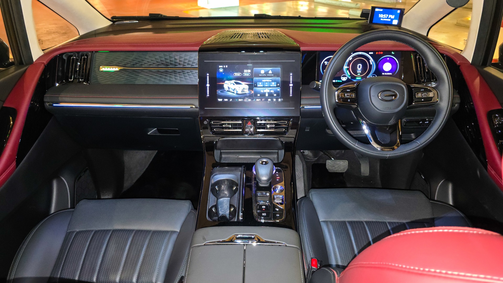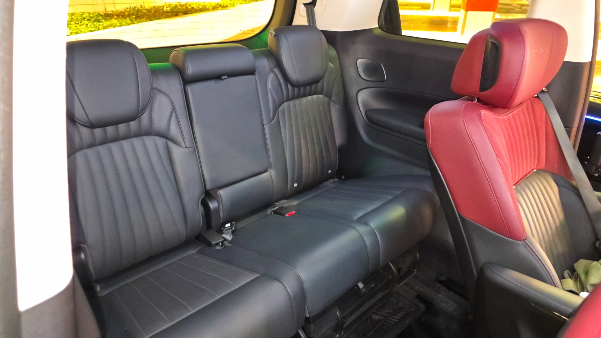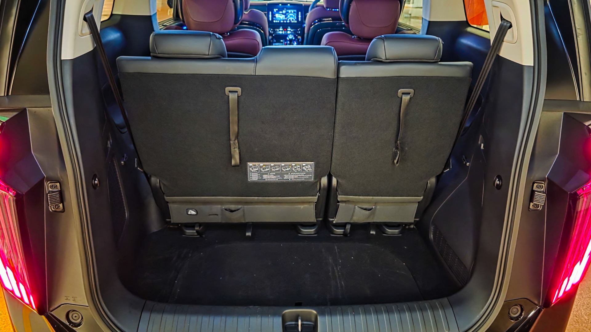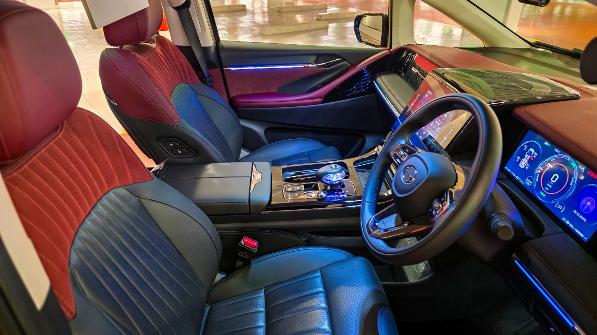 The two-tone wine red and black leather seats set a luxurious tone. In the GX variant, semi-aniline leather is used for the first and second rows, with leather upholstery in the third row. Materials feel premium throughout, and the cabin benefits from soundproof glass that keeps the environment quiet and serene. Visibility from the driver's seat is wide, helping offset the vehicle's size.
