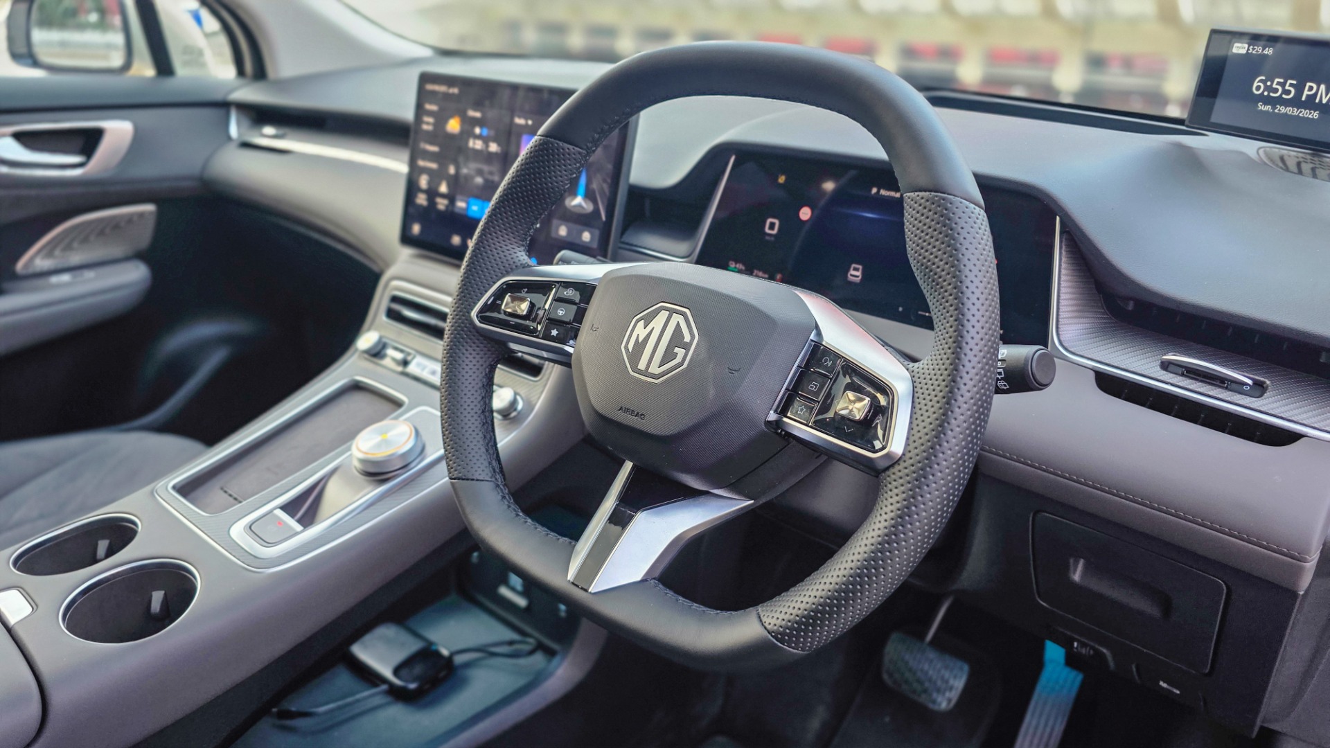 Step inside the MG S6 EV and the cabin immediately feels more premium than the S5. Leather wrapping is used generously throughout, including the dashboard, door panels and centre console. The seats appear to use Nappa-style material, and even the wireless charging pad area is wrapped in soft-touch trim, creating a cohesive upscale ambience.